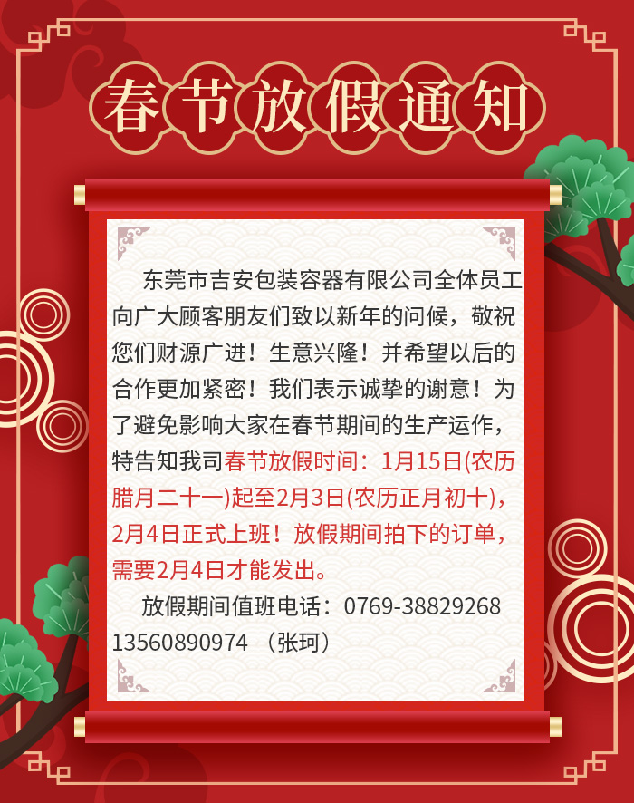 新春復始,萬象更新!非常感謝各位新老客戶長期以來對吉安容器的鼎力支持與關照,在新春來臨之際,東莞市吉安包裝容器有限公司全體員工向廣大顧客朋友們致以新年的問候,敬祝您們財源廣進!生意興??!并希望以后的合作更加緊密!我們表示誠摯的謝意!