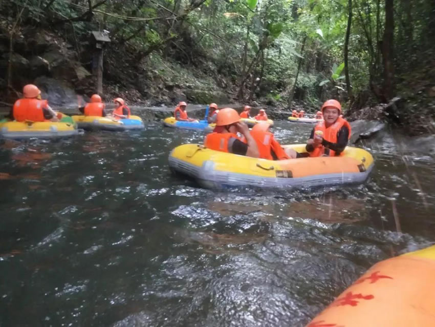 接下來等著我們的是大家期待已久的項(xiàng)目---漂流。古龍峽國際漂流賽道,全長6.1公里,高低落差378米,最高時速可達(dá)72km。在驚魂未定之際又戛然而止,好怕怕!