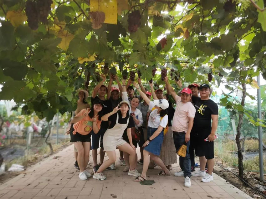 享用完酒店的早餐后,我們一行來到【醇葡鄉(xiāng)村.葡萄】農(nóng)家果園,該果園是目前清遠(yuǎn)最大的高科技葡萄種植園。品嘗了果大味甜的新鮮葡萄后,開心的眾人還在果園里進(jìn)行了舞蹈PK。各組組長帶領(lǐng)組員就公司平日里練習(xí)的舞蹈進(jìn)行比賽。果園老板都被大家的舞姿吸引,詢問“你們是哪里的公司,怎么如此具有活力?”“我們是吉安容器的團(tuán)隊(duì)”大家自豪響亮地回應(yīng)道,讓人感動!