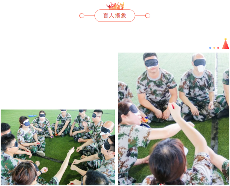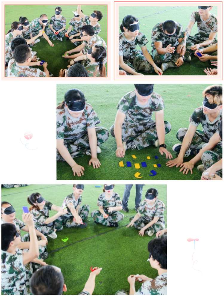 四組成員各自蒙住眼睛,每組團隊都會拿到34張6種顏色和6種形狀的卡片,其會有2種顏色各自缺少一個形狀的色板,每名成員將從教練手中領(lǐng)到2—3塊色板,團隊成員只能詢問教練拿到的版的顏色,團隊成員需要通過有效的溝通,合作,分析來判斷缺少的是那種顏色,哪個形狀算完成團隊任務(wù),以計時的方式得出勝負(fù)。