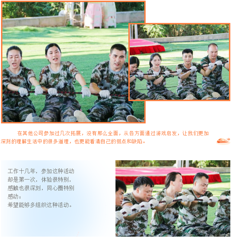 這是第三次與東莞三合團建團隊合作的團隊拓展項目,在前2次的團建活動中,三和團建根據(jù)我們每年的團建情況作出綜合分析,能夠從我們團隊面臨的一些問題制訂相對應(yīng)的拓展項目,通過挑戰(zhàn)、游戲的方式,讓團隊能夠更直觀的面對問題,面對自己的痛點,對于很多同事來說,通過一年一次的拓展活動,能夠從不同的角度重審自我,有句話是這么說的:“成年人不太容易給道理打動,他們習(xí)慣用自己的經(jīng)驗判斷問題?!蹦敲磮F建活動更像是把道理變成一種“經(jīng)驗”,能讓你從根本上去接受它。