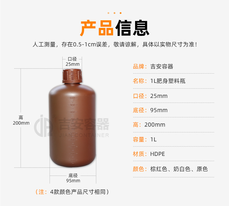 小口塑料瓶采用全新HDPE塑膠原料吹塑而成,具備韌性好、耐酸堿、耐腐蝕、不變形,密封性能佳等特點,可根據(jù)客戶需求定制、改色、產(chǎn)品適用于化工、清洗劑、醫(yī)藥、液體、食品、農(nóng)業(yè)等各行業(yè)包裝。