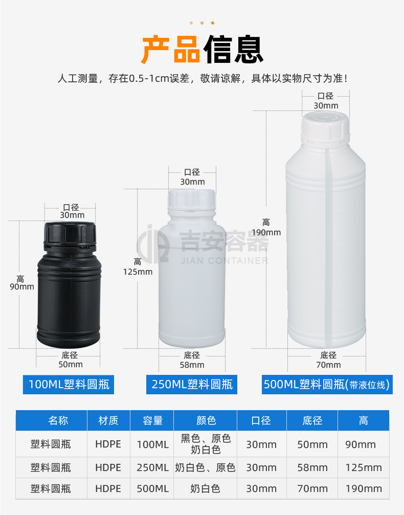 小口塑料瓶采用全新HDPE塑膠原料吹塑而成,具備韌性好、耐酸堿、耐腐蝕、不變形,密封性能佳等特點(diǎn),可根據(jù)客戶需求定制、改色、產(chǎn)品適用于化工、清洗劑、醫(yī)藥、液體、食品、農(nóng)業(yè)等各行業(yè)包裝。