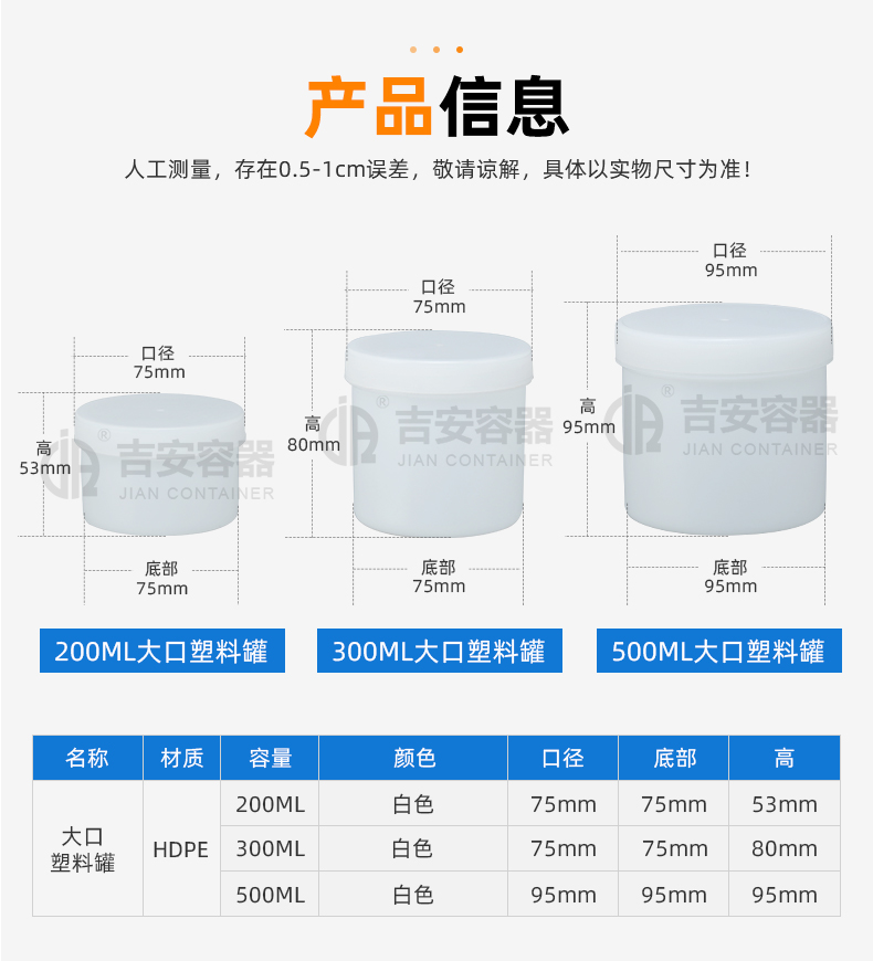 大口塑料瓶可分為螺旋式外蓋,按壓蓋外蓋、螺旋帶防盜等多種密封方式,內(nèi)外壁光滑,敞口盛裝、倒放物品方便,耐酸堿、耐腐蝕,無(wú)味,防漏性強(qiáng)。