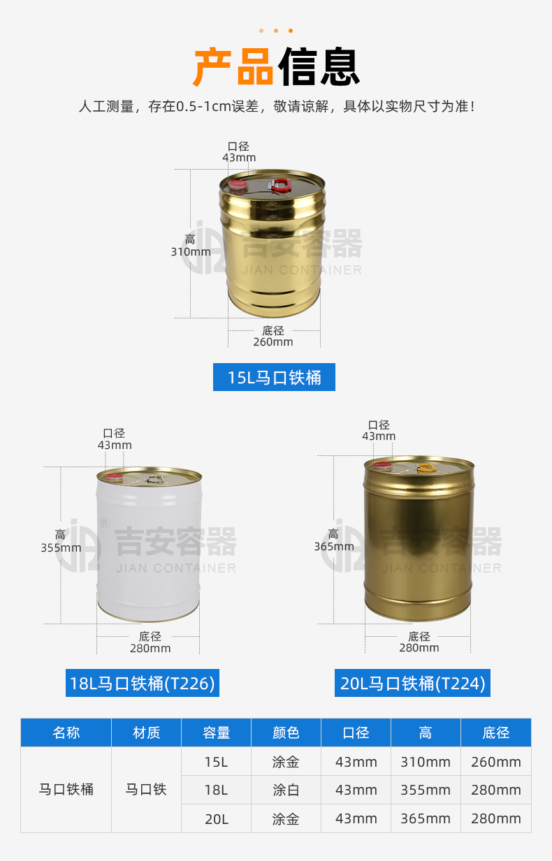 東莞市吉安包裝容器有限公司創(chuàng)立于2000年8月1日,是中國知名品牌企業(yè)。已通過ISO 9001質(zhì)量管理體系資質(zhì)認證,加入了中國中空協(xié)會,并獲得《中國知名品牌》,《國家標準合格產(chǎn)品》,《全國重合同守信用AAA級企業(yè)》,《質(zhì)量.服務.誠信AAA企業(yè)》等榮譽稱號。根據(jù)材質(zhì)的不同,我們的產(chǎn)品分為塑料容器、鐵質(zhì)容器、鋁材容器、玻璃容器、紙質(zhì)容器等五大類。按產(chǎn)品的名稱分為塑料桶、塑料瓶、包裝桶、涂料桶、機油桶、油脂桶、化工罐、膠水瓶、鐵桶、鐵罐、鋁瓶、鋁罐、阻隔瓶、高阻隔瓶等,容量從3ML至1000L多種規(guī)格,多種款式。適合包裝的產(chǎn)品包括:化學試劑、化工原料、化工助劑、飼料添加劑、油墨、油漆、樹脂農(nóng)藥、日用化學品、聚氨脂、膠粘劑,廣泛應用于化工、建筑、食品、醫(yī)療、生物等各領域。