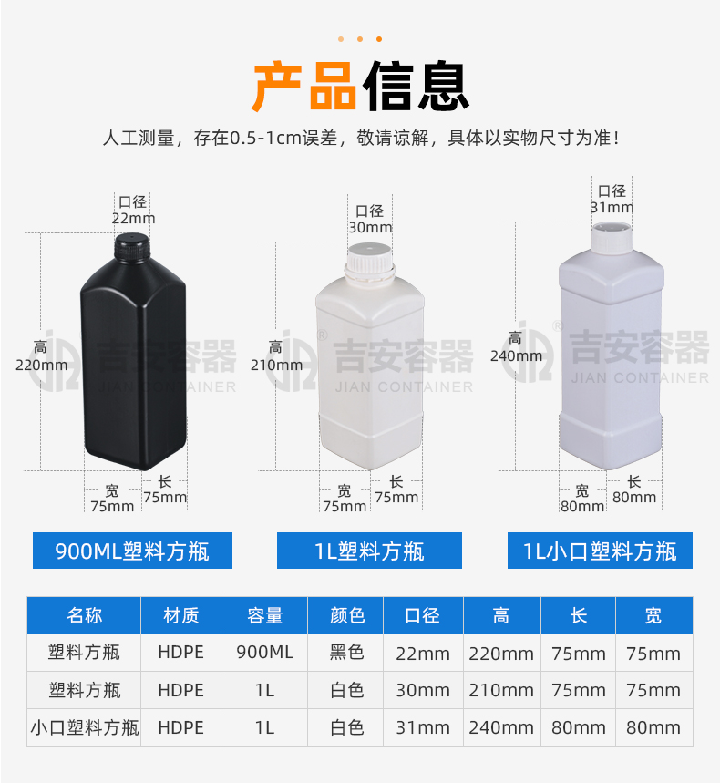 小口塑料瓶采用全新HDPE塑膠原料吹塑而成,具備韌性好、耐酸堿、耐腐蝕、不變形,密封性能佳等特點,可根據(jù)客戶需求定制、改色、產(chǎn)品適用于化工、清洗劑、醫(yī)藥、液體、食品、農(nóng)業(yè)等各行業(yè)包裝。