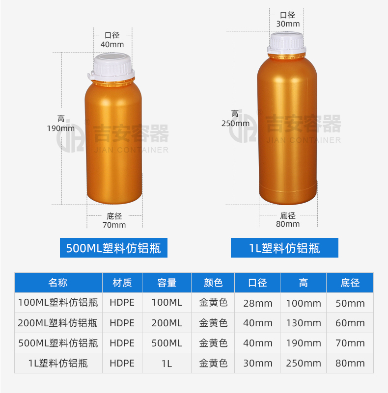 東莞市吉安包裝容器有限公司創(chuàng)立于2000年8月1日,是中國知名品牌企業(yè)。已通過ISO 9001質(zhì)量管理體系資質(zhì)認證,加入了中國中空協(xié)會,并獲得《中國知名品牌》,《國家標準合格產(chǎn)品》,《全國重合同守信用AAA級企業(yè)》,《質(zhì)量.服務.誠信AAA企業(yè)》等榮譽稱號。根據(jù)材質(zhì)的不同,我們的產(chǎn)品分為塑料容器、鐵質(zhì)容器、鋁材容器、玻璃容器、紙質(zhì)容器等五大類。按產(chǎn)品的名稱分為塑料桶、塑料瓶、包裝桶、涂料桶、機油桶、油脂桶、化工罐、膠水瓶、鐵桶、鐵罐、鋁瓶、鋁罐、阻隔瓶、高阻隔瓶等,容量從3ML至1000L多種規(guī)格,多種款式。適合包裝的產(chǎn)品包括:化學試劑、化工原料、化工助劑、飼料添加劑、油墨、油漆、樹脂農(nóng)藥、日用化學品、聚氨脂、膠粘劑,廣泛應用于化工、建筑、食品、醫(yī)療、生物等各領域。
